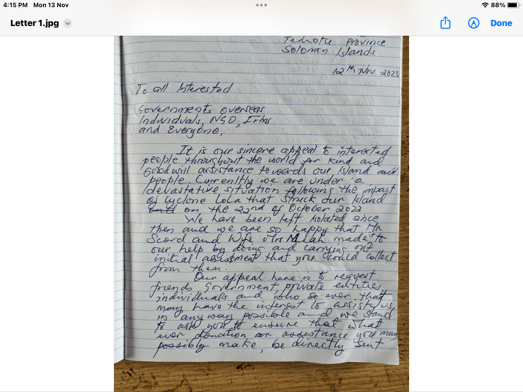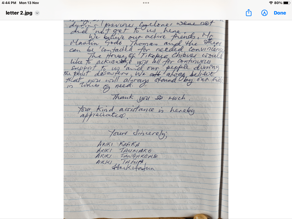 we have been asked by the Arikis( chiefs) of Tikopia after cyclone Lola for support.
